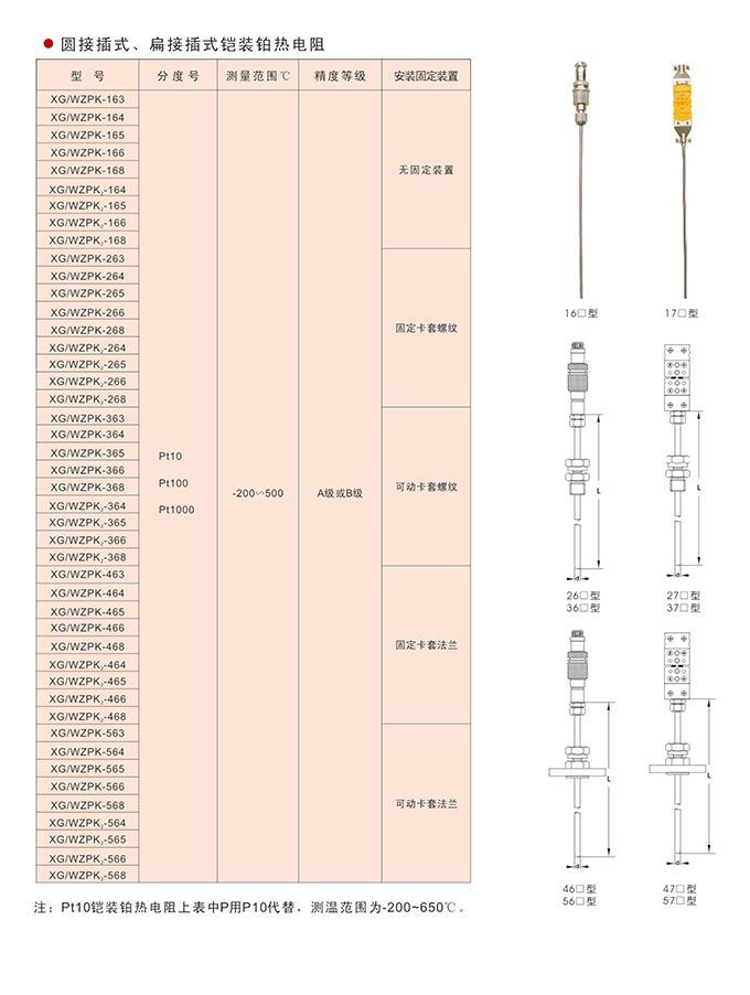 圓接插式(扁接插式)鎧裝鉑熱電阻,采用引進(jìn)型的鉑電阻測溫元件,具有靈敏、熱響應(yīng)時(shí)間快、質(zhì)量穩(wěn)定、易彎曲、抗震性好、使用壽命長等優(yōu)點(diǎn)。鎧裝鉑電阻外保護(hù)套采用不銹鋼,內(nèi)充滿高密度氧化物質(zhì)絕緣體,因此,它