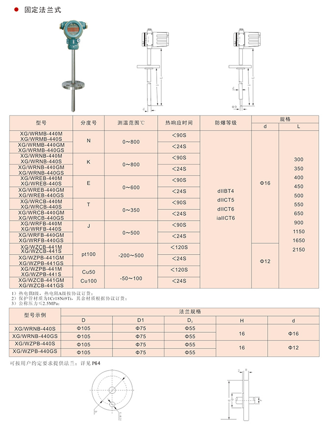 固定法蘭式,現場顯示一體化熱電偶(阻)一種新型結構的測溫儀表,現場LCD或LED數字顯示,溫度變送器二線4~20mA.DC信號輸出,感溫元件可采用鎧裝壓簧式抗震結構,感溫元件與上保護管采用圓筒隔爆結構,具有可抽芯的特點。適用于石油、化工、輕工、電力等行業,空氣、蒸汽、薄霧等介質中含有碳氫化合物等爆炸性混合物及腐蝕性的場所,測量范圍-200~1000℃,現場顯示特別適用于無法用雙金屬溫度計等測量的高溫介質中。