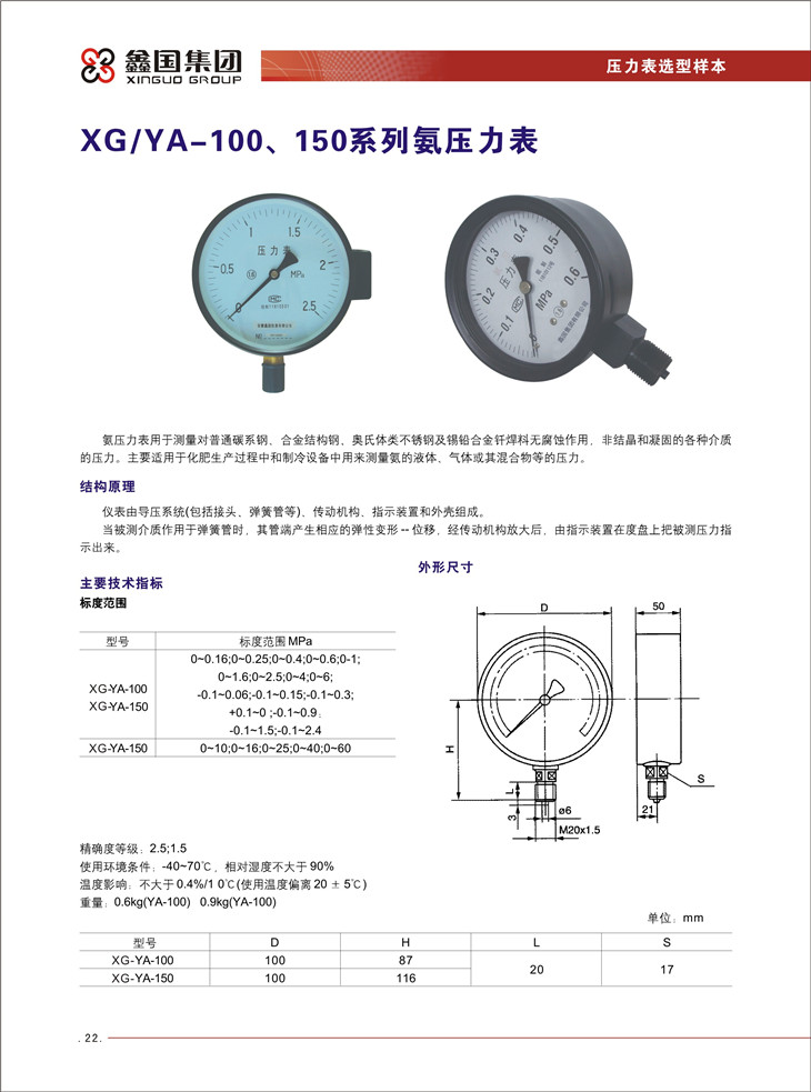 XG-YA-100/150系列氨壓力表,氨壓力表用于測(cè)量對(duì)普通碳系鋼,合金結(jié)構(gòu)鋼,奧氏體類不銹鋼及錫鉛合金釬焊料無(wú)腐蝕作用,非結(jié)晶和凝固的各種介質(zhì)的壓力。氨壓力表主要適用于化肥生產(chǎn)過(guò)程中和制冷設(shè)備中