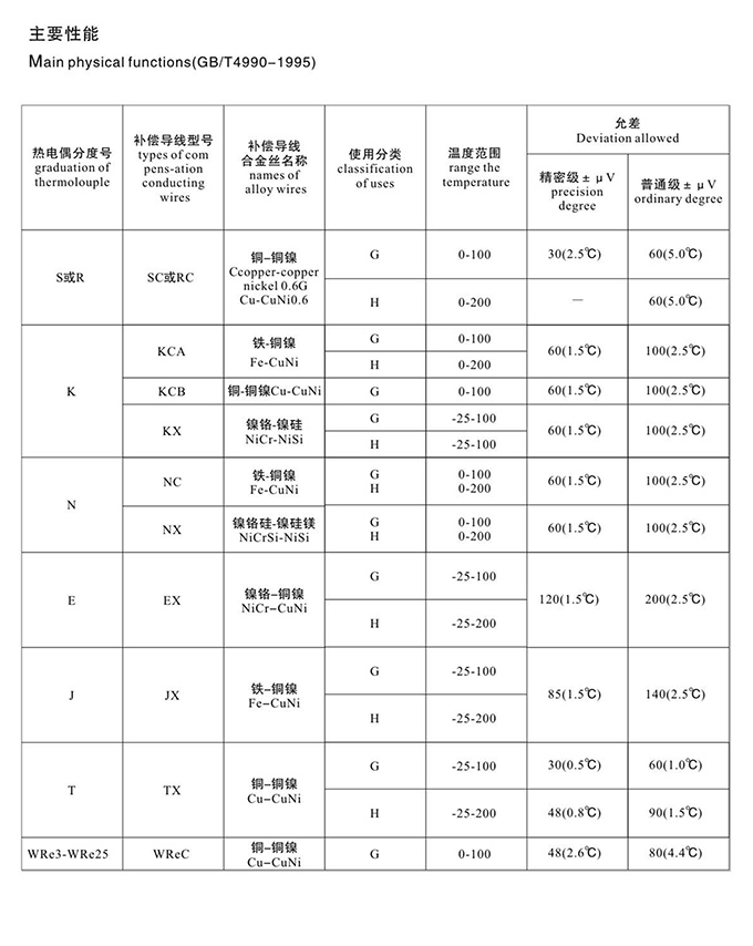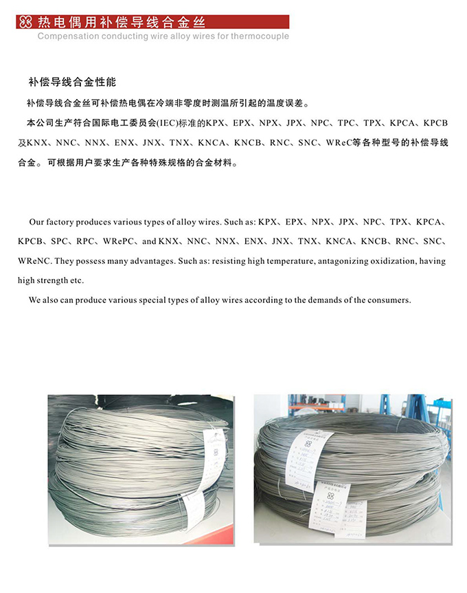 本公司生產符合國 際電工委員會( IEC )標準的 KPX、EPX、NPX、JPX、NPC、TPC、TPX、KPCA、KPCB及KNX、ENX、NNX、JNX、NNC、TNX、KNCA、KNCB、RNC、SNC、LNX、WReC 等各種型號的補償導線合金絲??筛鶕脩粢笊a各種特殊規格的合金材料。